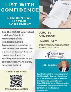 Join the SBAOR for a virtual training of the RLA. Knowledge of the Residential Listing Agreement is essential in residential real estate. Gain a better understanding of the contract and the ancillary documents so you can confidently and safely help your sellers.